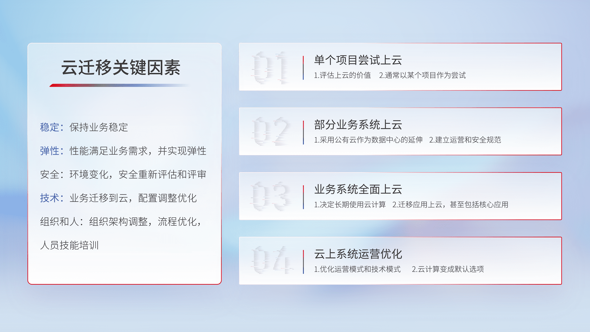 结合实际业务,,,从规划设计、、云平台选型、、、、云原生改造、、、数据迁移、、、集成交付,,,,迁移全过程为客户识别最佳上云路径,,,做好风险识别管理,,,,设计网络架构、、、、身份权限、、安全审计合规、、、、操作审计、、、、日志审计、、、、监控告警策略、、、多站点容灾设计等,,,,对云上基础设施进行整体规划,,提升IT治理水平,,,,以满足弹性、、高可用、、高性能的需求。。