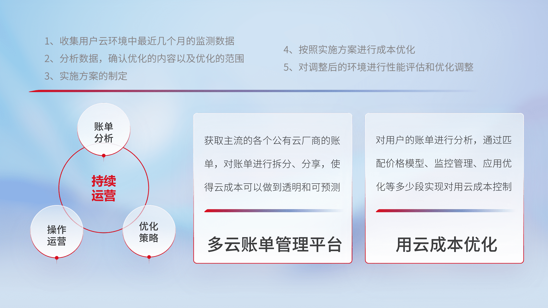 通过多云纳管,,,,以统一的资源数据模型把客户的云资源进行抽象和封装,,,进而实现对多云资源的统一操作,,保障云资源管理的可靠性、、、稳定性与可用性。。。量身定制化运维内容,,配置、、、、开发运维、、、补丁管理、、、、备份、、、、监控、、、认证和访问管理、、、审计和日常巡检等,,,保障在用云过程中的可靠度,,,稳定度以及高可用率。。。